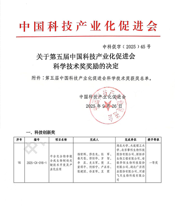 中国科技产业化促进会科学技术奖是经国家科学技术奖励工作办公室批准设立,面向全国的社会科技奖项,旨在表彰在科技创新和产业化领域做出突出贡献的个人和团队。“平台化合物非粮合成生物制造关键技术开发及产业化应用”项目由湖北大学联合大连理工大学、北京擎科生物科技股份有限公司等企业协同攻关,利用合成生物学技术,创立了一站式工业菌株数据分析平台与数据库,研发了具有自主知识产权的生物元件预测与鉴定、高效基因组编辑等技术,构建了非粮乙醇、D-乳酸、1,3-丙二醇等高产稳产工业菌株,实现了利用非粮原料高效生产多种平台化合物的产业化应用。项目对推动我国生物制造产业升级,保障粮食安全和实现“双碳”目标具有重要意义。