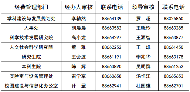 2、学科建设与发展规划处负责学科建设经费购置资产计划的立项审核;人事处负责人才项目经费购置资产计划的立项审核;科学技术发展研究院负责自然科学类科研经费购置资产计划的立项审核;人文社会科学研究院负责人文社科类科研经费购置资产计划的立项审核;本科生院负责本科实验实训教学场所(基地)资产购置计划的立项审核;研究生院负责研究生培养项目经费购置资产计划的立项审核;实验室与设备管理处负责实验室资产购置计划的审核与报批;校园建设与米兰电竞,米兰(中国)化办公室负责新建房屋与构筑物项目(含电梯、中央空调、锅炉等固定资产)的审核。经费审批部门对所审核项目负责。经费审批部门工作人员联系方式如下: