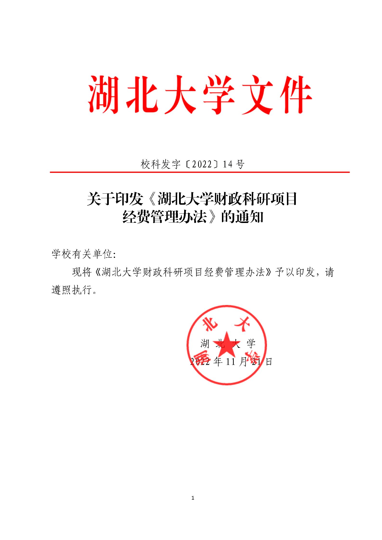 校科发字〔2022〕14号 关于印发《湖北大学财政科研项目经费管理办法》的通知